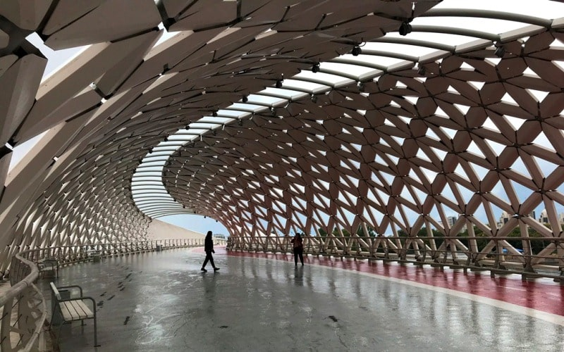 В центральной части моста предусмотрен участок с навесом, образованным ромбовидными элементами. Всего в декоративной оболочке используется около 2450 алюминиевых «лепестков», каждый из которых имеет индивидуальную форму.