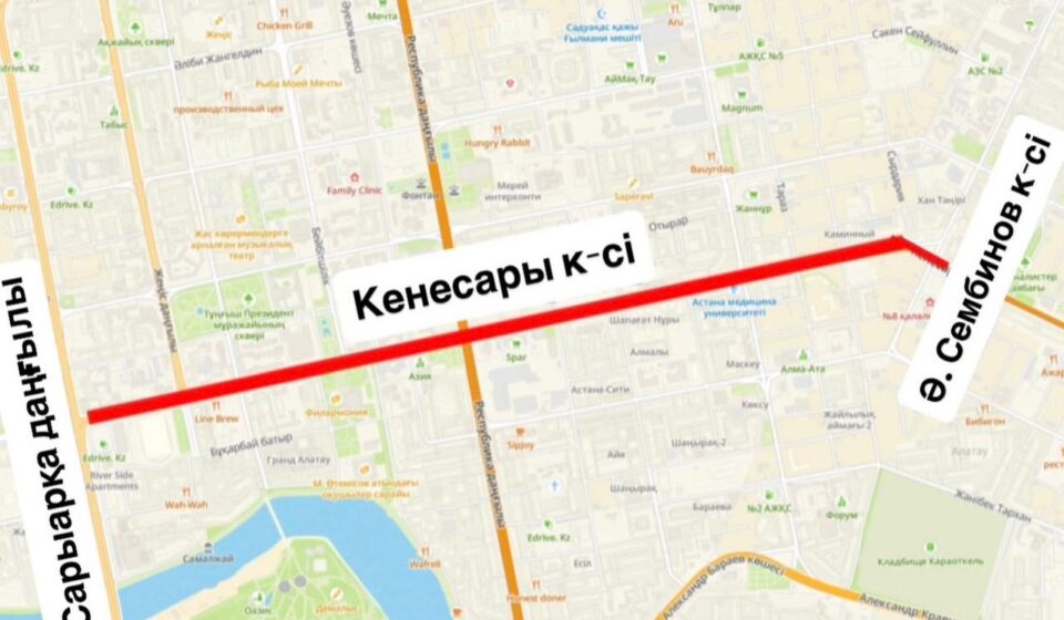 Ограничения касаются участка улицы Кенесары между улицей А. Сембинова и проспектом Сарыарка. По мере проведения ремонта движение здесь будут закрывать частями.