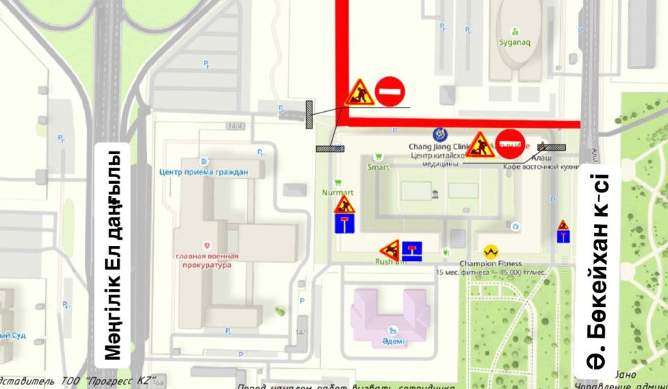 В Астане с 26 апреля по 1 сентября полностью перекроют движение на участке между бизнес-центром «Syganaq» и жилым комплексом «Ишим». Ограничение вводится в рамках проекта строительства улиц в районе пересечения проспекта Мәңгілік Ел и улицы Сыганак.