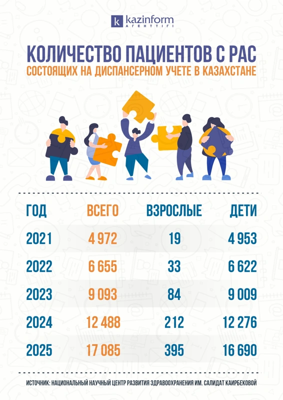 В Казахстане же среднегодовой рост за последние пять лет достиг около 36%. Согласно данным Национального научного центра развития здравоохранения имени Салидат Каирбековой Минздрава РК, 2024 году на диспансерном учете состояли 12,5 тысяч человек, из них 212 взрослых и 12,3 тысяч детей. Уже в 2025 году этот показатель вырос до 17,1 тысяч, куда входит 395 взрослых и 16,7 тысяч детей.
